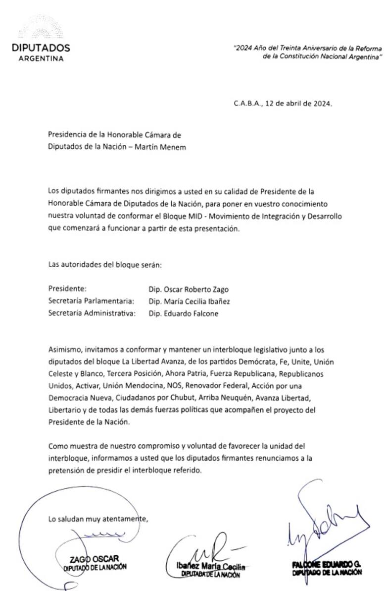“El bloque MID comenzará a funcionar a partir de esta presentación”, dice la misiva con fecha de hoy, que intuían algunos participantes de la fuerza libertaria, pese a que todavía imaginaban otras opciones para zanjar diferencias. Ahora quedará con 38 miembros, como cuando arrancaron, pero con cambios internos.