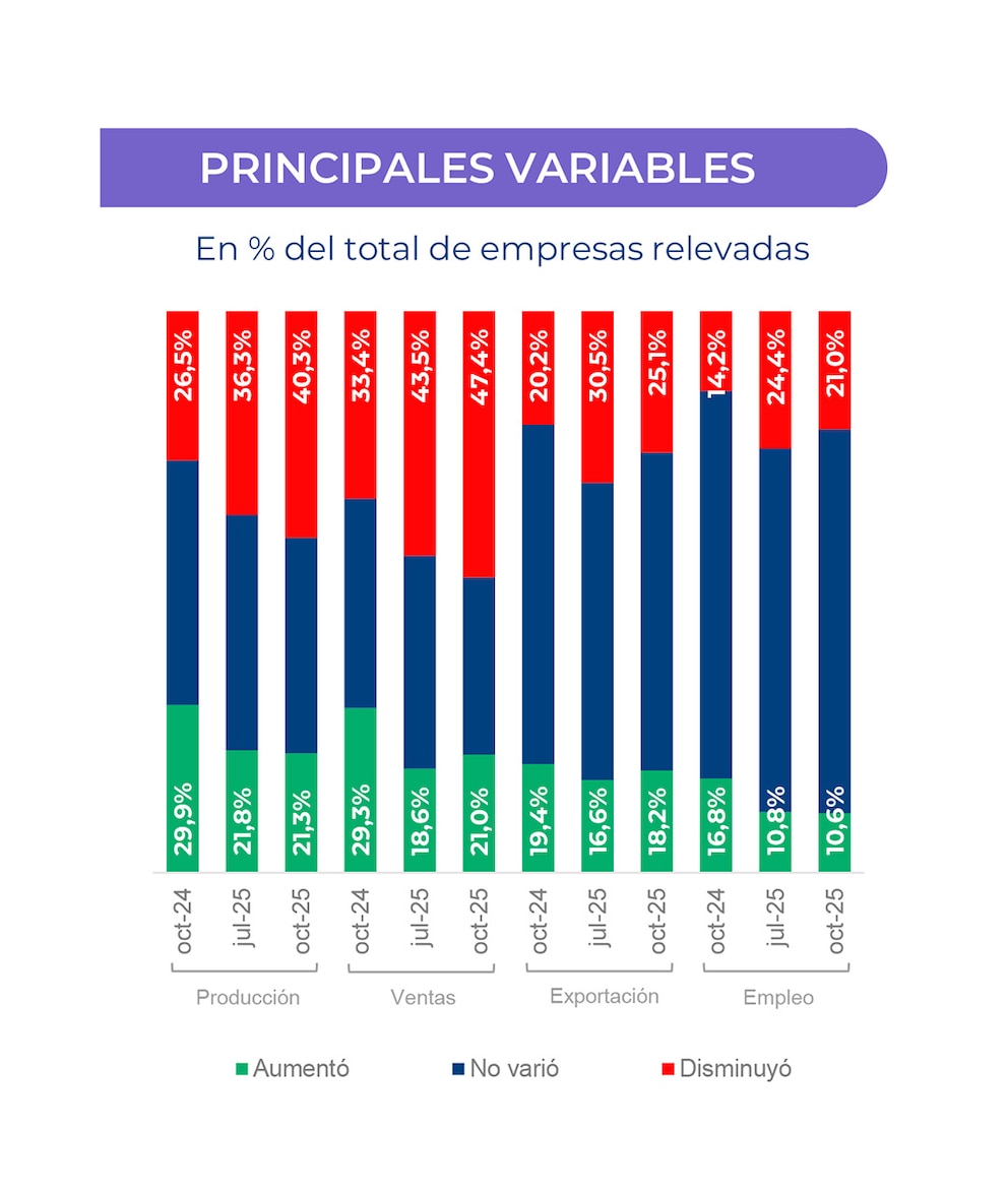 La situación de las PyMEs siguió la misma tendencia que el total de la muestra. Este grupo registró predominio de caídas en producción, ventas y empleo. En producción, las Micro y Pequeñas mostraron un índice de difusión de -22,5 puntos, mientras las Medianas y Grandes registraron -13,5 puntos. En ventas, las Micro y Pequeñas alcanzaron -31,4 puntos, frente a -17,7 puntos en las Medianas y Grandes. En empleo, el índice se mantuvo en -10,4 puntos para todos los tamaños.
